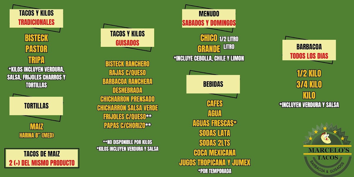 Marcelo’s Tacos offers a delightful selection of authentic Mexican dishes, each bursting with flavor. One standout is the Taco De Chicharron Prensado, a savory option that features tender, well-seasoned pork that perfectly complements the soft taco shell. For those with a sweet tooth, the Empanadas De Cajeta Con Nuez provide a unique twist on a classic dessert, with a rich caramel filling and crunchy walnuts. The Taquitos Al Pastor are a fan favorite, packed with marinated pork and crispy texture, making each bite a satisfying experience. The menu also includes the Tacos De Harina Varios Guisados, where customers can choose from a variety of fillings, ensuring a personalized dining experience. For a hearty meal, the Combo De 4 Tacos C Todo is a great option, offering a selection of four tacos with all the traditional toppings. Lastly, the Taco De Rajas Con Queso stands out for its creamy cheese and flavorful roasted peppers, making it a comforting choice for cheese lovers. Together, these dishes represent the essence of Marcelo’s Tacos-rich, flavorful, and perfect for anyone craving an authentic taste of Mexico.
